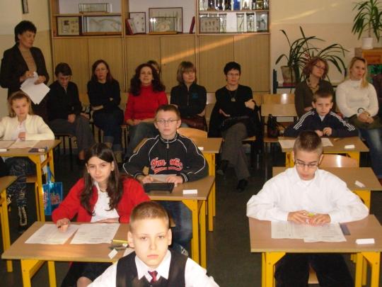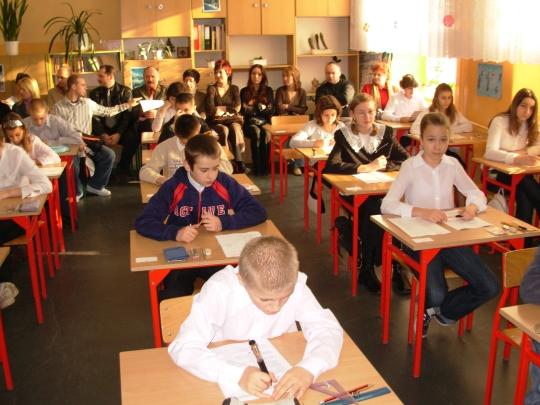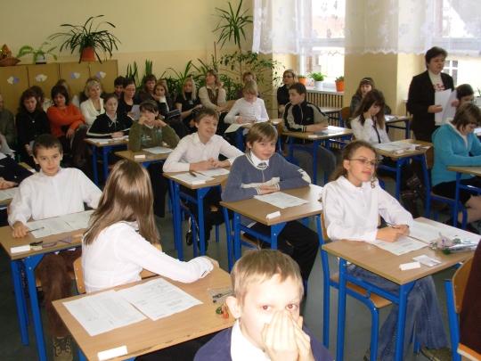 Uczniowie klasy 6c na kilka minut przed rozpoczęciem próbnego testu (z tyłu - rodzice)
